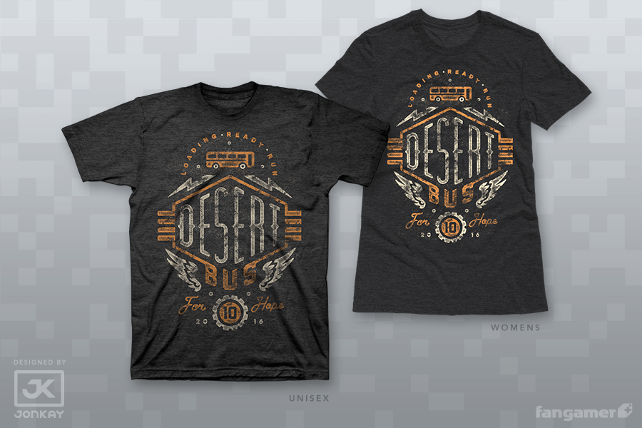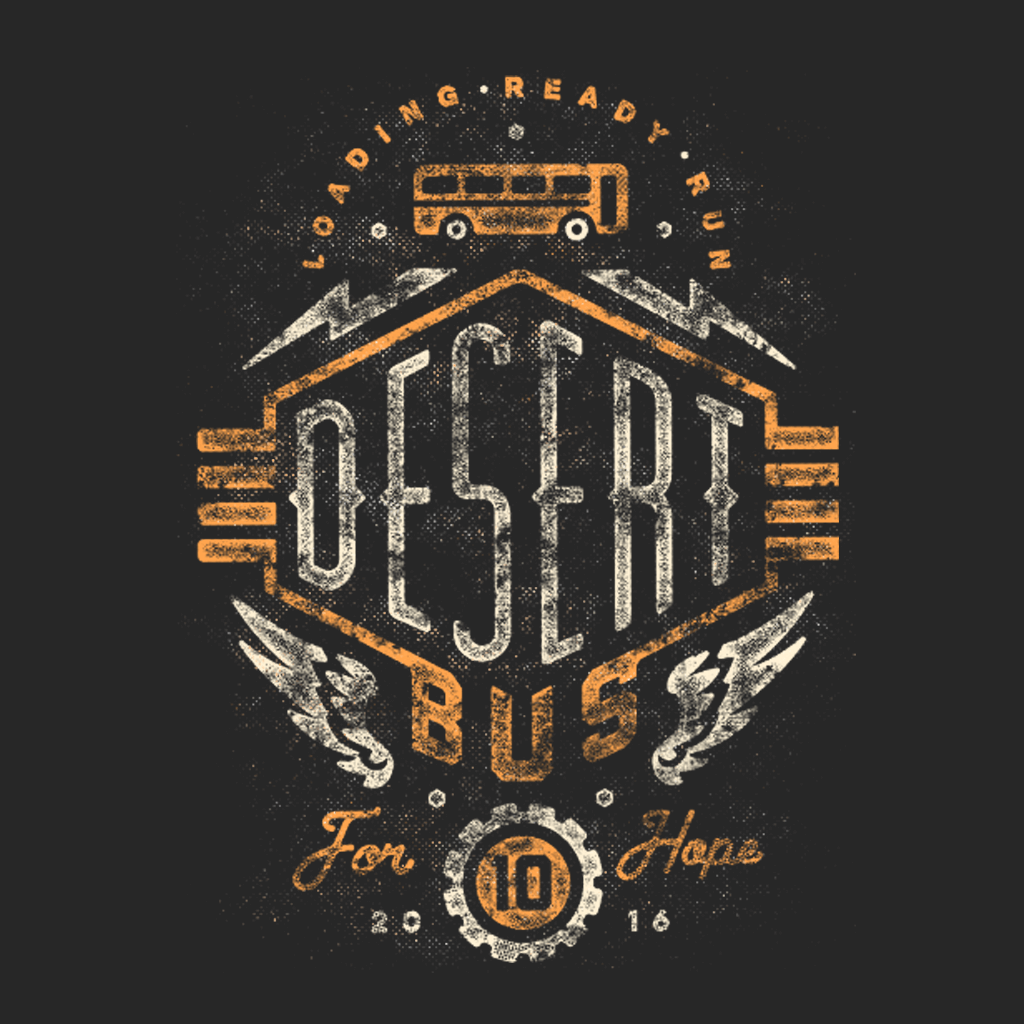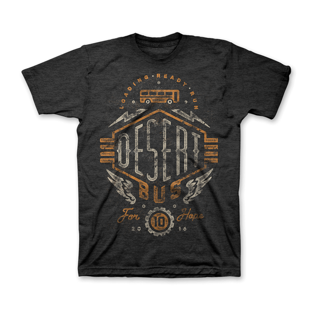 Desert Bus is back! Pick up the t-shirt celebrating the 2016 edition of the world's most boring, intensely compelling gaming charity event while supplies last and all the profits from each sale will go to benefit Child's Play. (Of course they'll also go to keeping the Loading Ready Run crew locked up in the cockpit of the Desert Bus for Hope even longer.)
