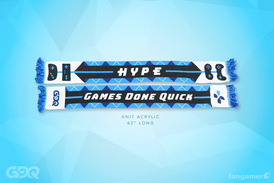 Each knit acrylic scarf reads "Games Done Quick" on one side and "Hype" on the other, and measures 63" long. (That's 160 cm, if you subconsciously replaced "soccer stadium" with "football stadium" a couple sentences ago.)