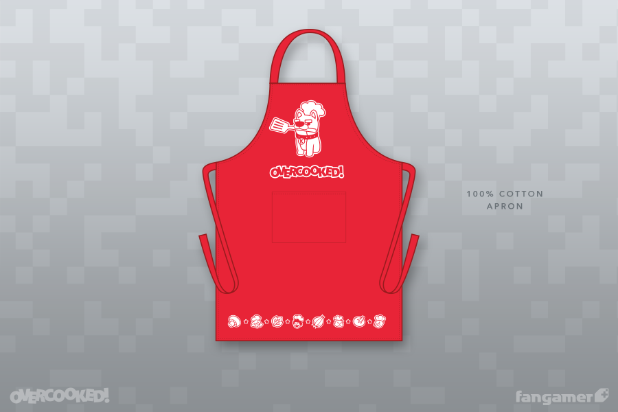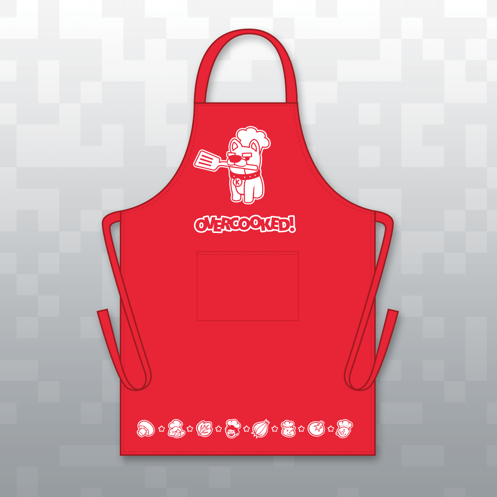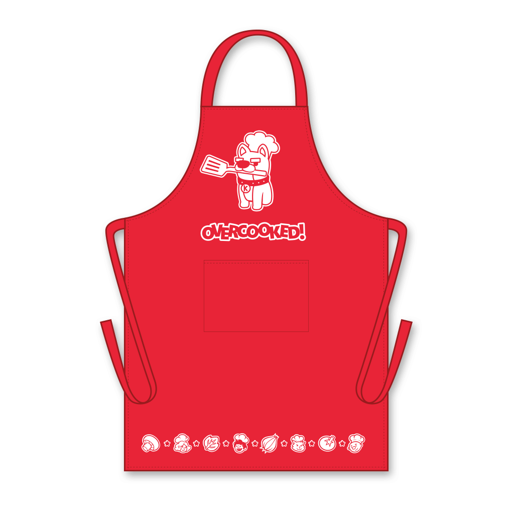 This official Overcooked apron measures about 30 inches tall and 22 inches wide. Features an adjustable neck strap and two front pockets.