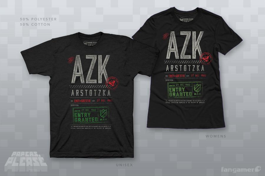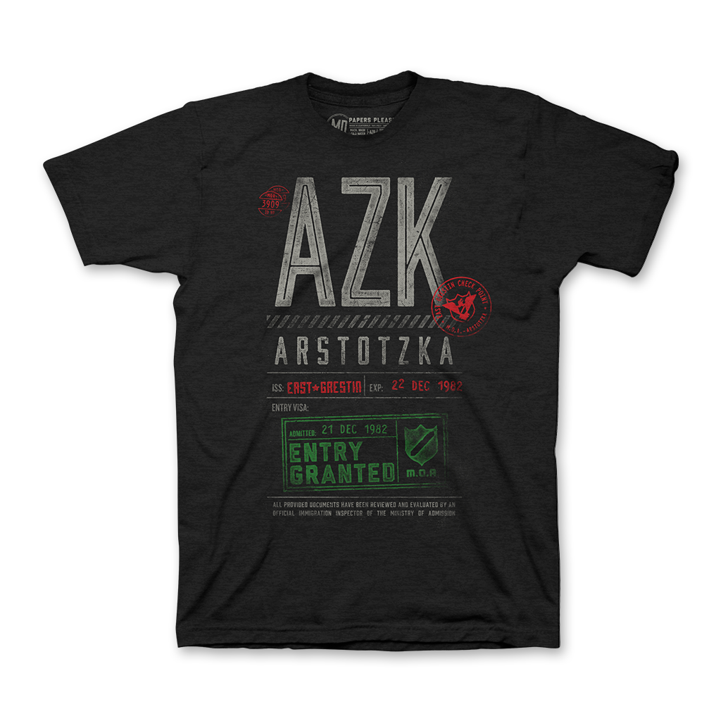 This official Papers, Please shirt was designed by our own Tony Kuchar and printed on super-soft, heather black 50/50 shirts from American Apparel and District. Each one comes with a free button from the East Grestin checkpoint.