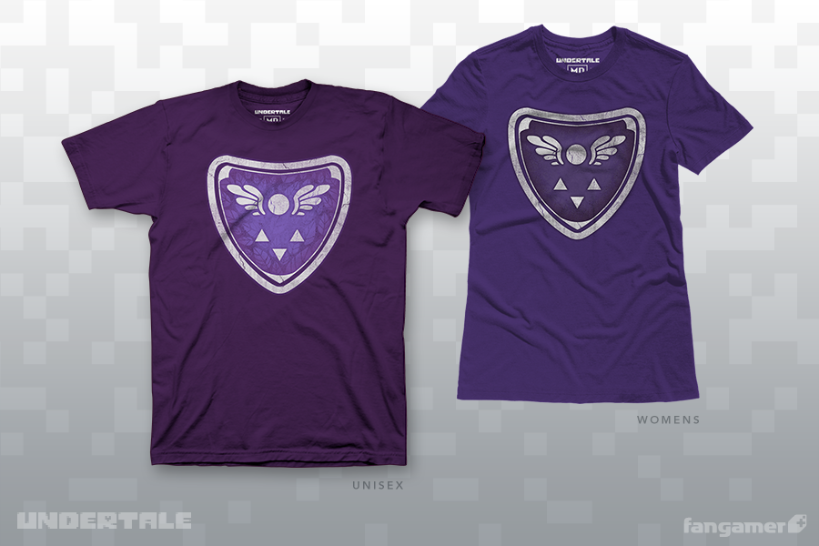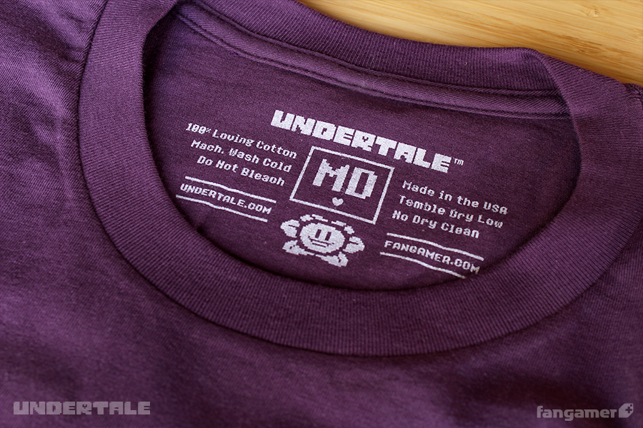 This official Undertale shirt was printed on soft, 100% cotton shirts in eggplant purple*. (Unisex sizes 3X-6X are printed on 50/50 shirts from Port & Company.) Each one comes with a bonus sticker.